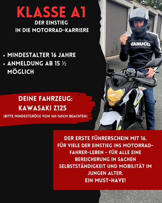 A1 ist der perfekte Einstieg in die Welt des Motorradfahrens und kann später auf höhere Klassen A2 oder A erweitert werden.